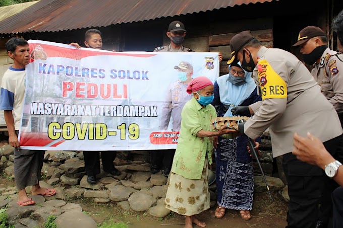 SOLOK AROSUKA, Pionir - Dua warga Nagari Gantung Ciri Kecamatan Kubung Kabupaten Solok mendapatkan tali asih dari Kapolres Solok AKBP Azhar Nugroho,SH, S.IK, M,Si dalam giat Jum'at Berbagi Barokah, Jum'at (10/7/2020).