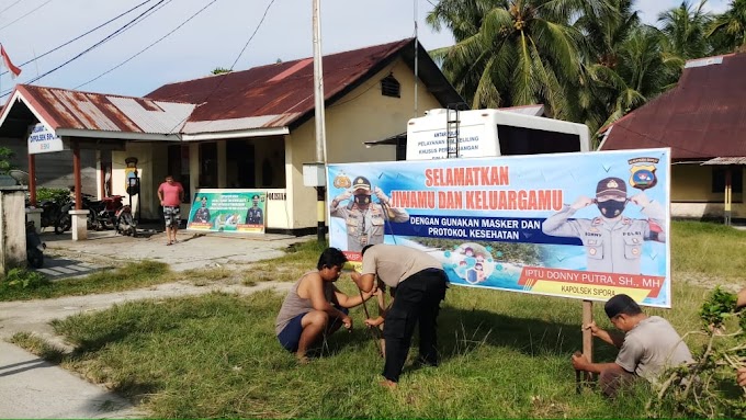 MENTAWAI, Pionir—Guna menumbuhkan kesadaran masyarakat menggunakan masker, Kapolsek Sipora, Polres Kepulauan Mentawai, Polda Sumatera Barat (Sumbar) Iptu Donny Putra, SH. MH bersama anggota memasang spanduk yang berisikan imbauan mengenai kepatuhan untuk tetap memakai masker dan mematuhi protokol kesehatan, pada Senin 7 Juni 2021.
